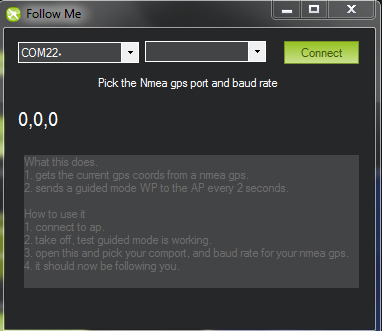 - Once you click “Connect”, the Mission Planner will read the GPS data from your device and send it to your Copter as “fly to here” commands every two seconds.