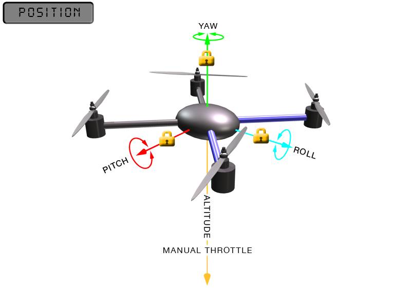 Position mode is the same as loiter mode, but with manual throttle control. This means that, in position mode, the copter maintains a consistent location and heading, while allowing the operator to control the throttle manually.