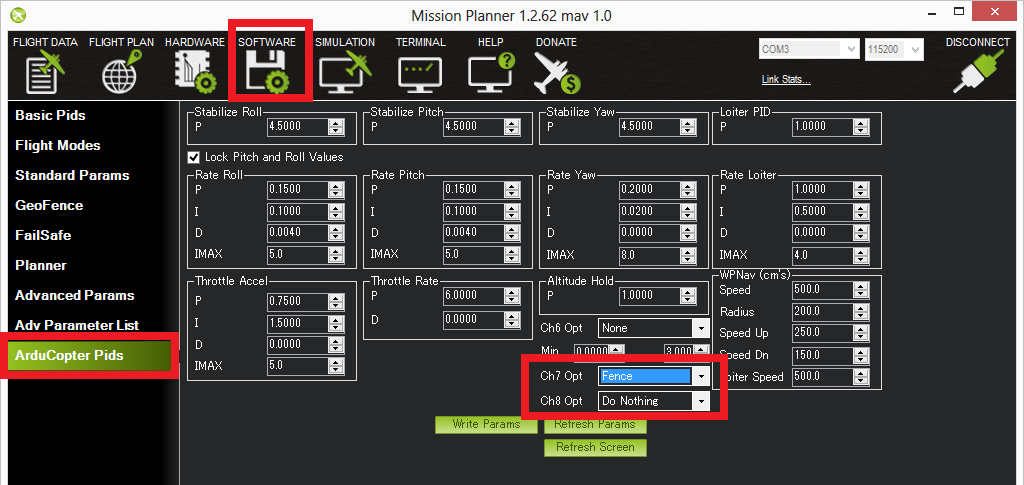 - Go to the Mission Planner’s Config/Tuning > Extended Tuning screen and set either “Ch7 Opt” OR “Ch8 Opt” to Fence.