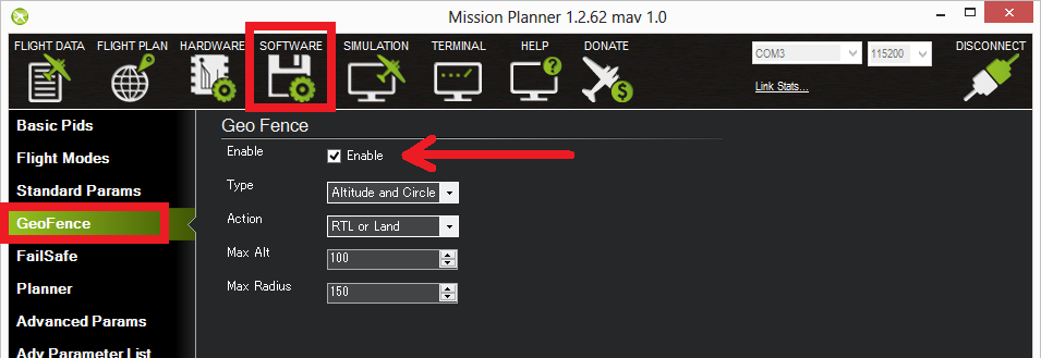 Enabling the Fence in Mission Planner¶