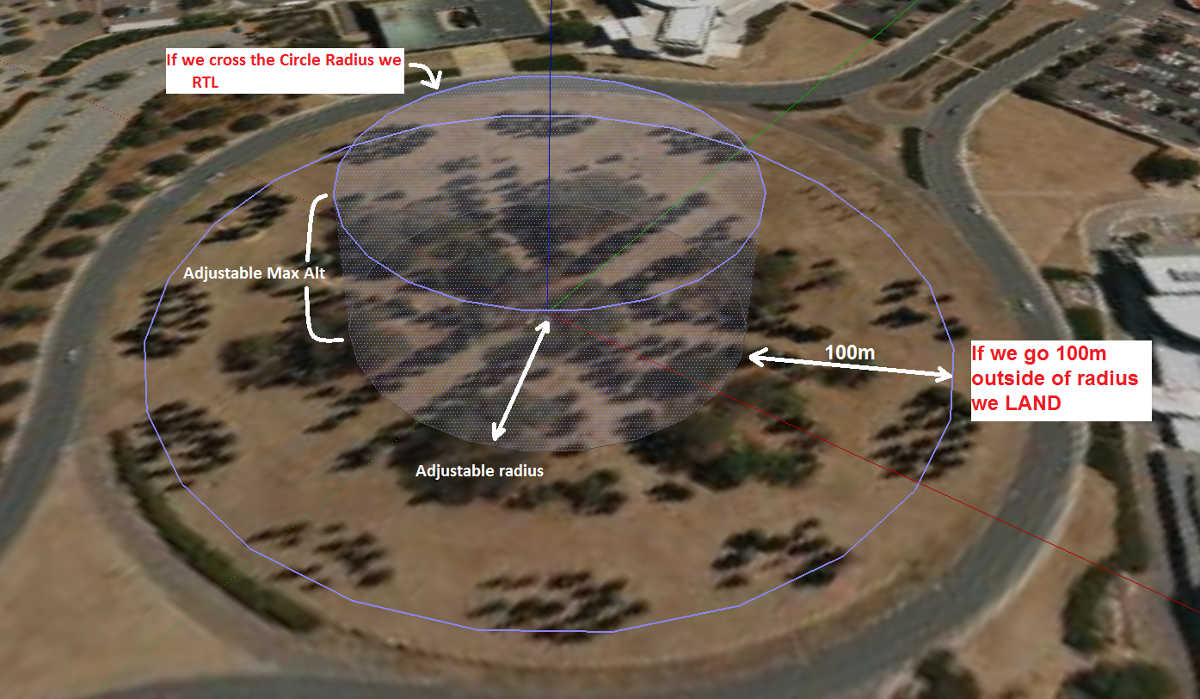 If the copter eventually flies 100m outside the configured fence distance, the vehicle will switch into LAND mode. The idea being that it’s clearly impossible to get the copter home so best to just bring it down. The pilot can still retake control of course with the flight mode switches. Like with the earlier fences, another fence is erected 20m out which will again switch the copter to LAND if it continues away from home.