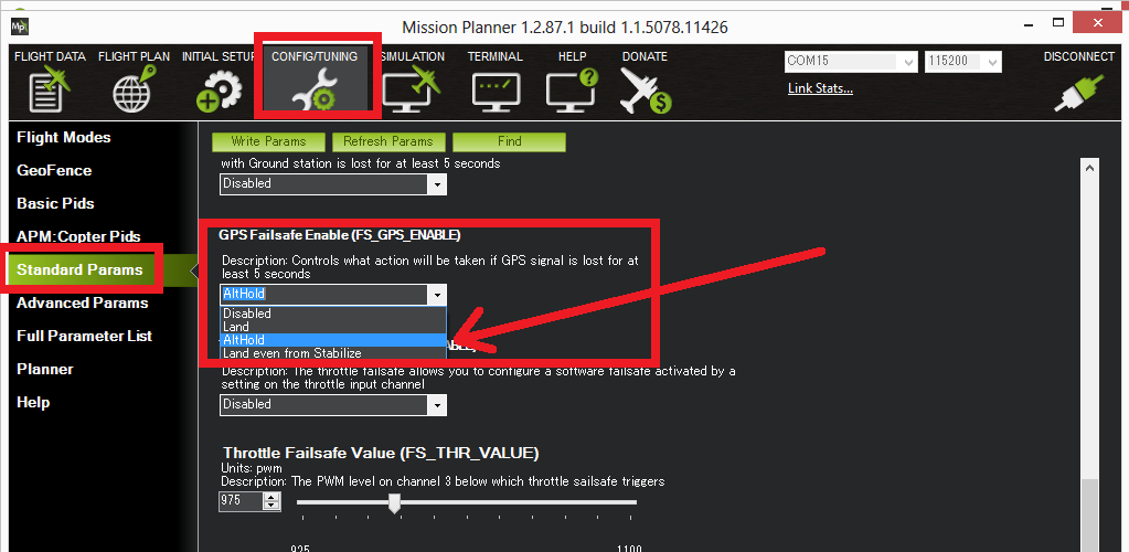 The GPS Failsafe is enabled by default but you can enable or disable it on the Mission Planner’s Standard Parameter List, by set the FS_GPS_ENABLE parameter to 0 (Disable) or 1 (Land) or 2 (switch to AltHold). It is highly recommended to leave it enabled and no known reason why it should ever be disabled.