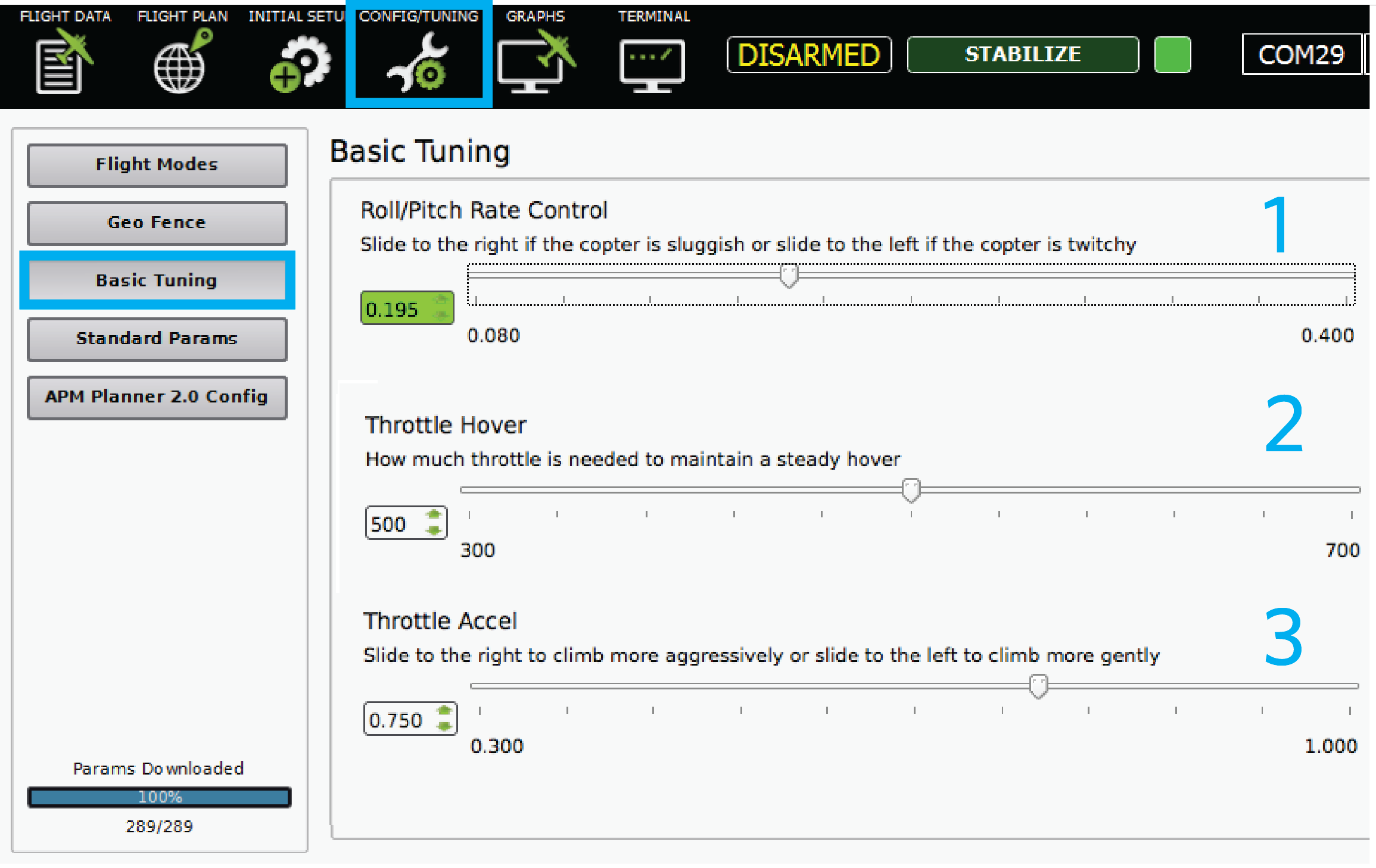 Connect the telemetry radio ground module to your ground station computer and open either Mission Planner or APM Planner. Select the correct COM port and select Connect. You should see live data on the Flight Data screen. To begin tuning, select Config/Tuning and Basic Tuning.