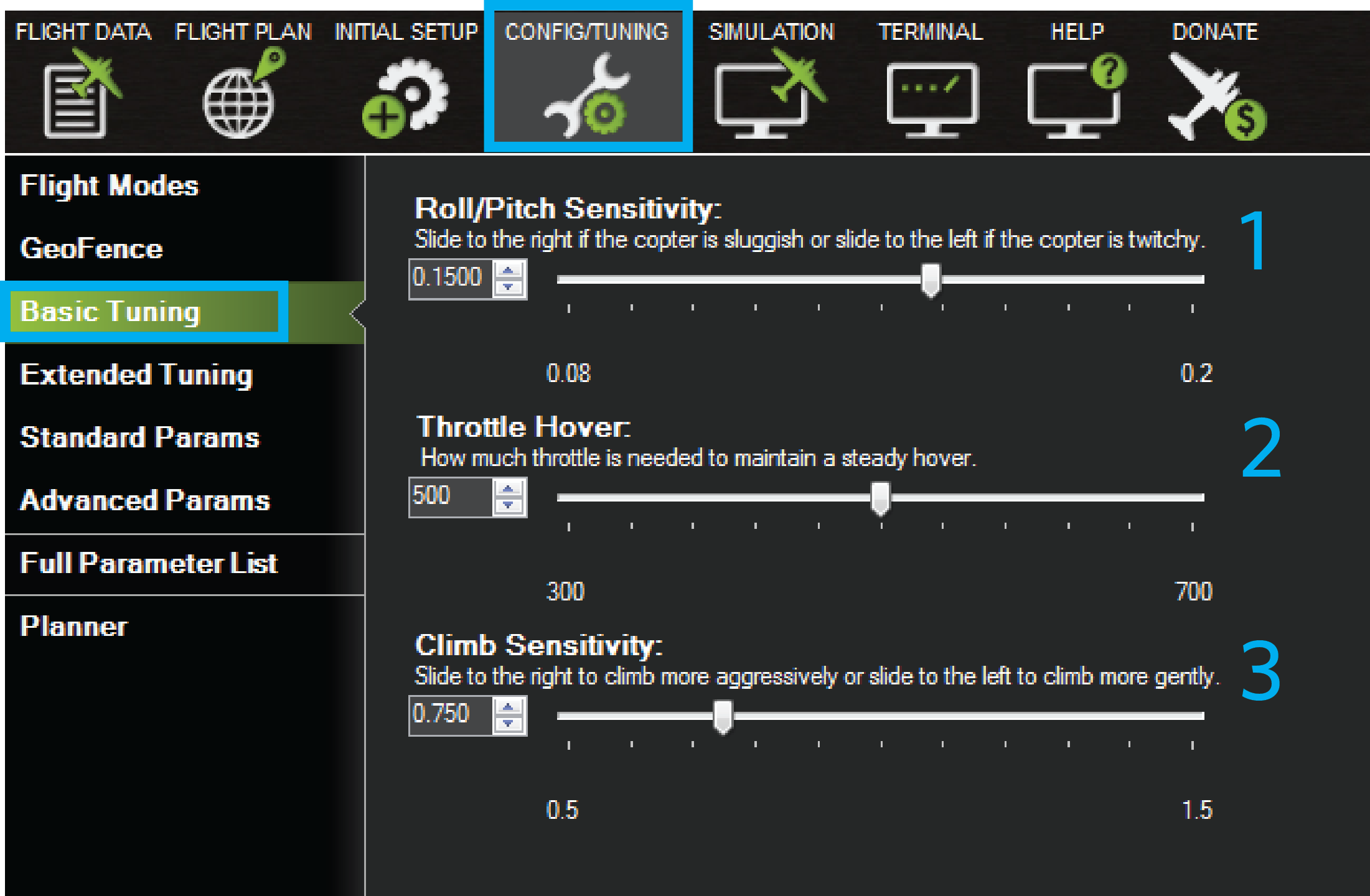 After your first flight, you may notice that you copter doesn’t respond to control inputs the way you want it to or you may have trouble maintaining control of your copter. If you are familiar with PID controllers, check out the advanced tuning guide here. If you are an experienced operator, try out the autotune feature. This page will cover the basic tuning section of Mission Planner and APM Planner that simplified the complex tuning process into a few simple sliders. This is the best tuning method for new operators.