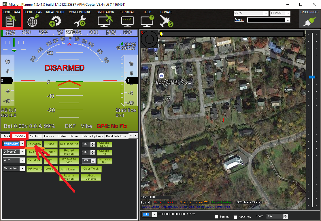 Note that even with automatic gyro calibration disabled, the gyros calibration can be triggered manually from the Mission Planner (and perhaps some other ground stations) using the Flight Data screen’s Actions tab. Select “PREFLIGHT_CALIBRATION” from the top-left drop-down and then press the “Do Action” button.