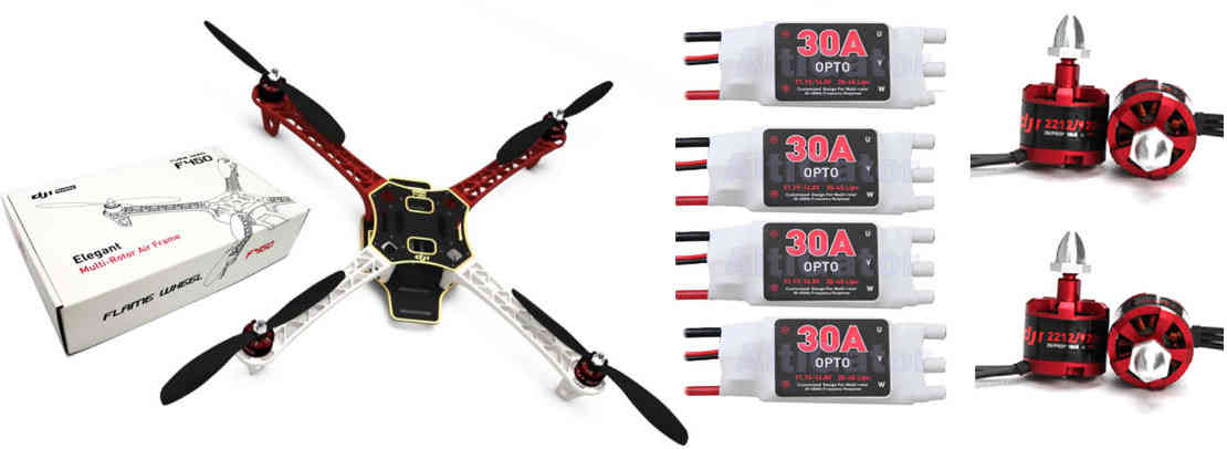 - This kit comes with frame with built in power distribution board, the 4 motors and the 4 Electronic Speed Controls and 8 Propellers.
