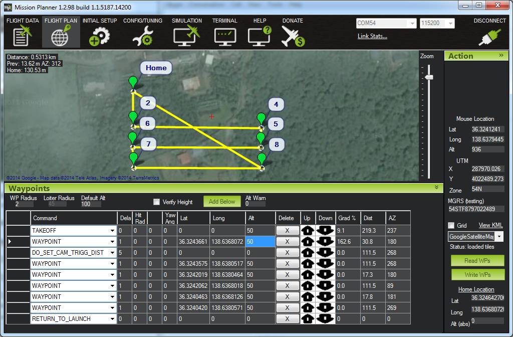 WAYPOINT - provide as many waypoints as required to fly over the scene in a grid pattern. Altitude should be entered in the “Alt” column. Adding “1” to the “Delay” columns will cause the copter to momentarily stop at each waypoint.