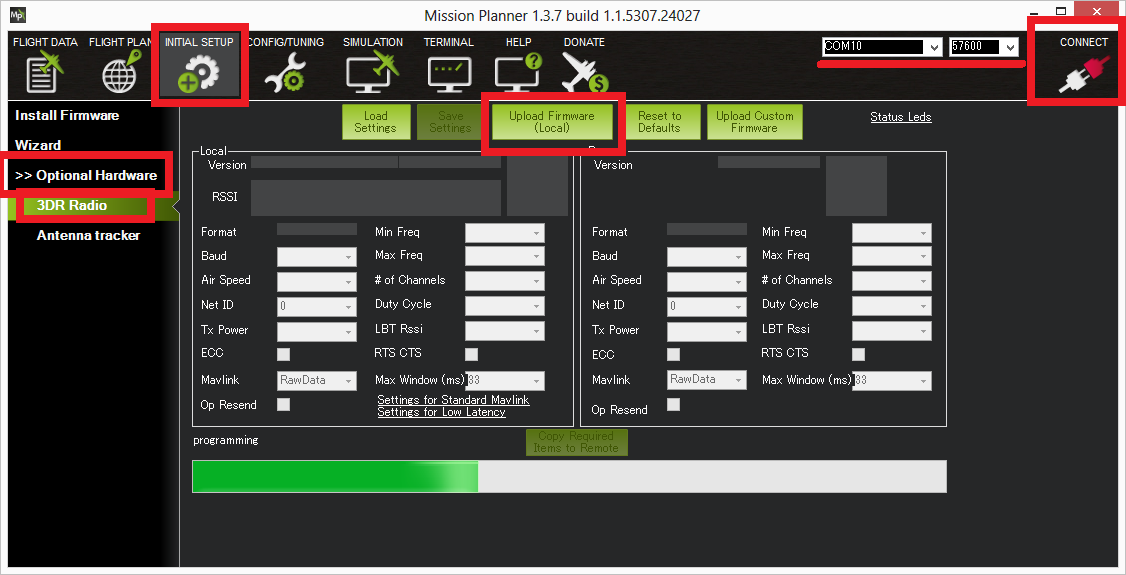- Open the Mission Planner and go to the Initial Setup | Optional Hardware | SiK Radio page.