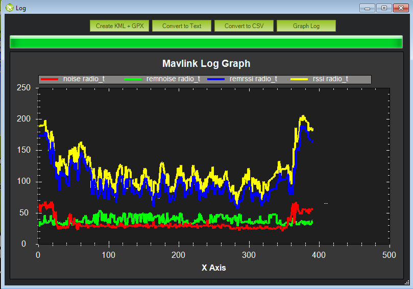 To work out what sort of noise you have, open up mission planner and choose the “telemetry logs” tab. Then choose Tlog> Kml or Graph. When the window pops up choose Graph Log and select a log from a test flight with your radios. Wait for the log to load, then choose the following items to log: