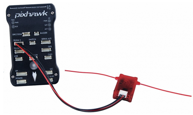 The ADSB receiver comes with a DF13 serial cable that can be plugged directly into a Pixhawk serial port. The Ping sensor should be mounted so that the antenna is oriented vertically.