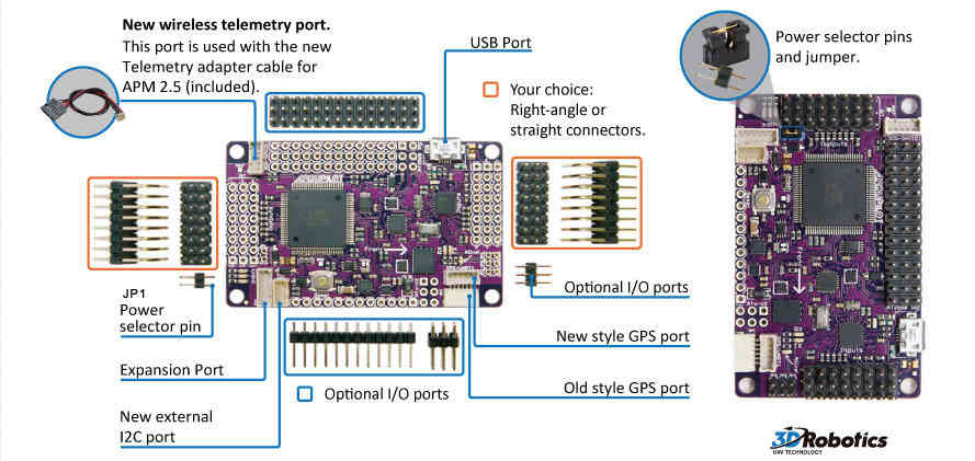 The APM 2.5 board requires no assembly, and is ready for firmware. You have a choice of side or top entry pin configuration, in order to accommodate a variety of installations. You’ll see this option when you order.