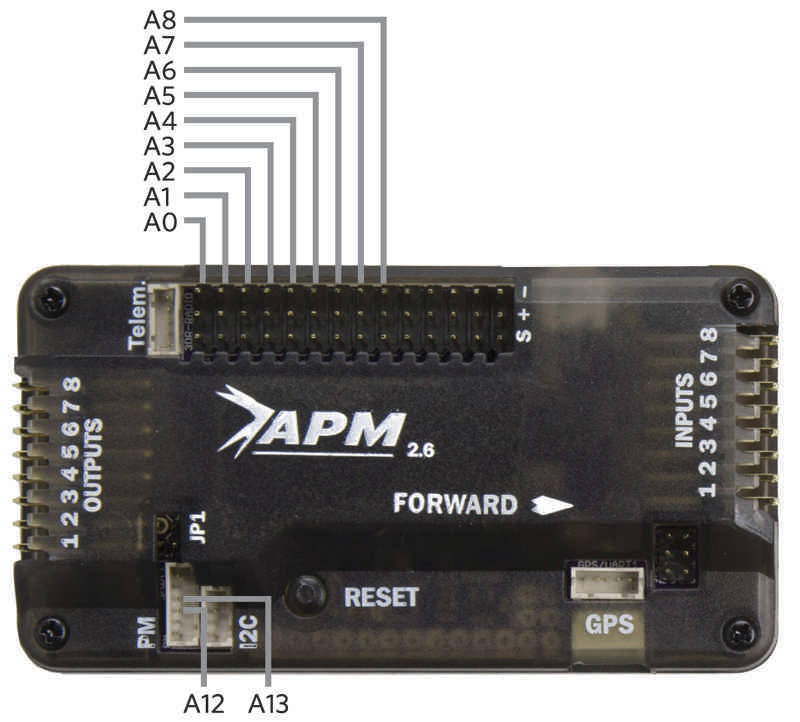 Pin 0 to 8: The APM2 has a row of analog input pins down one side, labelled A0 to A8 on the underside of the board. These are available as pin numbers 0 to 8 inclusive in PIN variables.