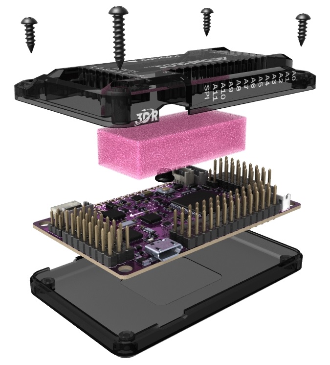 The APM 2.5/2.6 board is shipped in an enclosure with foam protecting the barometric pressure sensor, as shown here.