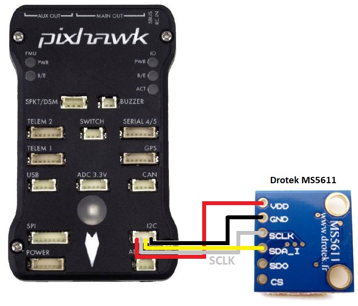 On the top of the Drotek MS5611 board, the “I2C” jumper should be soldered. Look for “I2C/SPI” written on the board.