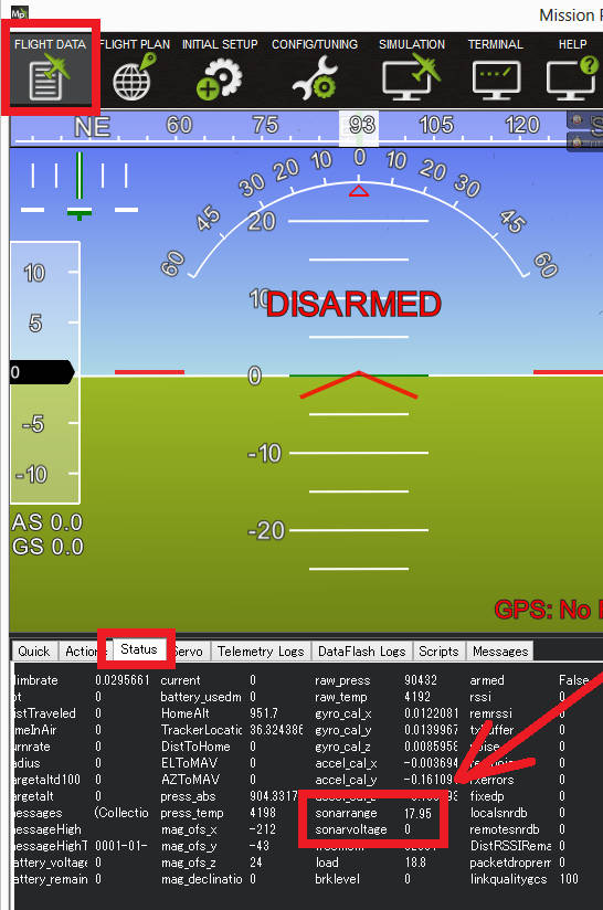 Distances read by the sensor can be seen in the Mission Planner’s Flight Data screen’s Status tab. Look closely for “sonarrange”.
