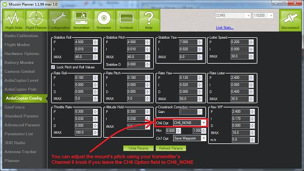 Gimbal configuration through the mission planner¶