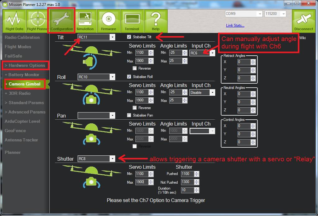 Under the configuration Menu, Hardware Options you will find a Camera Gimbal set-up screen. (see image below)
