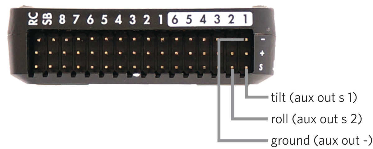 Connect the gimbal to Pixhawk’s auxiliary output pins. Connect tilt (pitch) to aux out signal (s) pin 1, roll to aux out signal (s) pin 2, and ground to an aux out ground (-) pin.