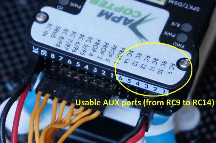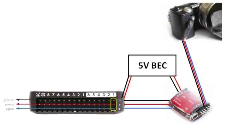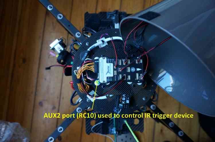 Pixhawk has 6 AUX ports that may be used for triggering the camera (see AUX1-AUX6 = RC9-RC14). This tutorial uses port 2/AUX2, as shown in the diagram below: