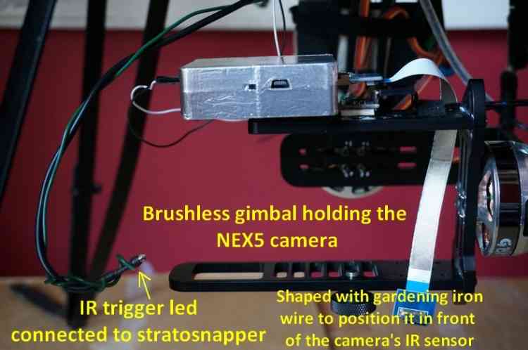 The Sony NEX5 is held in a 2-axis stabilized brushless gimbal (NEX5 not shown). Here below a zoomed view of the IR LED positioning and gimbal: