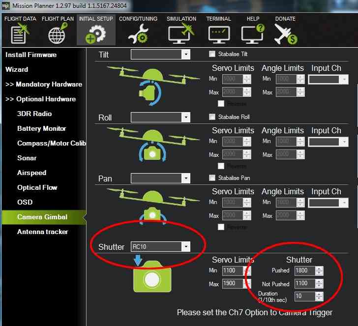 CAM_TRIG_TYPE: 0 (Servo).Shutter (Port): RC10 (AUX2).Shutter Pushed: 1800Shutter Not Pushed: 1100Shutter Duration: 10 (1 second)Servo Limits Max: 1900Servo Limits Min: 1100CH7_OPT: 9 (Optional - enables manual shutter triggering on Copter only).