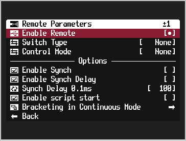 To tell CHDK to listen to the cable, we need to set the Enable Remote parameter. On the camera, access the CHDK menu, select Remote Parameters, and select Enable Remote as shown. This setting must be enabled to allow communication with the CHDK cable.