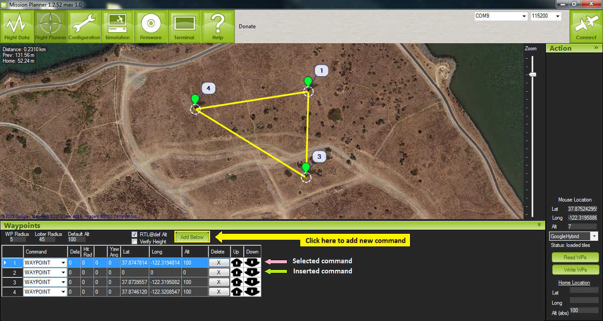 Once you have your waypoints configured in Mission Planner as shown below, select your first waypoint and click “Add Below”.