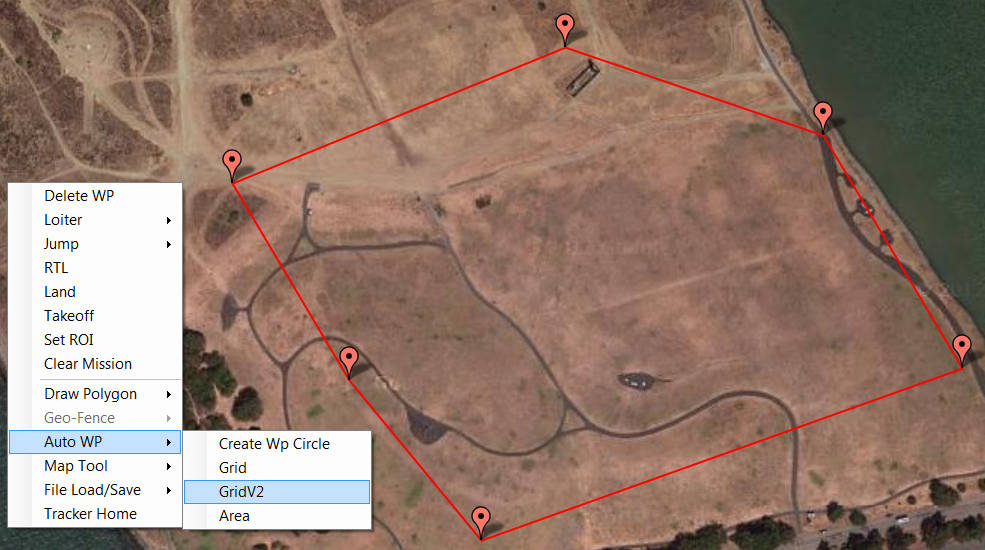 First locate the area you wish to map in Mission Planner. Right-click and select Draw Polygon| Add Polygon Point. Add polygon points until you have created a polygon around the area you wish to map. Once you are satisfied with your polygon, right-click and select Auto WP | GridV2 as shown below.