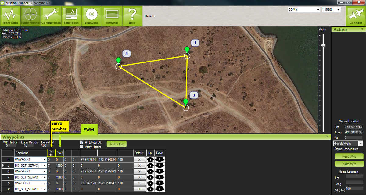 For your new command, set Command type to DO_SET_SERVO. (This tells the flight controller that this command means output to a servo.) Set Ser No(servo number) to the number of your camera control channel (ex:7). (This tells the flight controller where to output: for us, servo channel 7 is the CHDK cable.) And set PWM to 1900. (This value tells the flight controller what to output: 1,900 microseconds of pulse width modulation corresponds to the high position under which the shoot command is located). Repeat this process for each waypoint at which you would like to take a picture. The screen below shows a shutter command correctly applied at each of three waypoints.