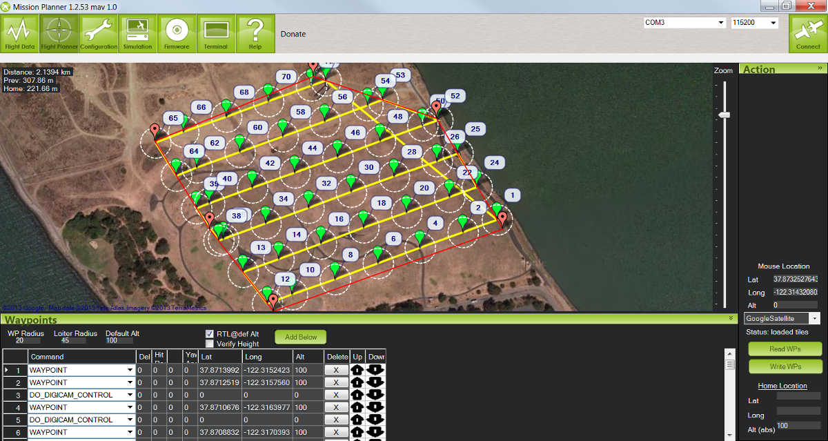 One of our favorite applications of CHDK is creating a map of an area by stitching automatically-captured pictures into a composite image. We’ll use the same 3DR_Shoot.basscript that we used in the previous section. The process is similar to setting shutter triggers at waypoints, only to make sure we capture the entire area we need more frequent, more regular waypoints. We’ll do this automatically using Mission Planner’s Grid V2 automatic waypoint function.
