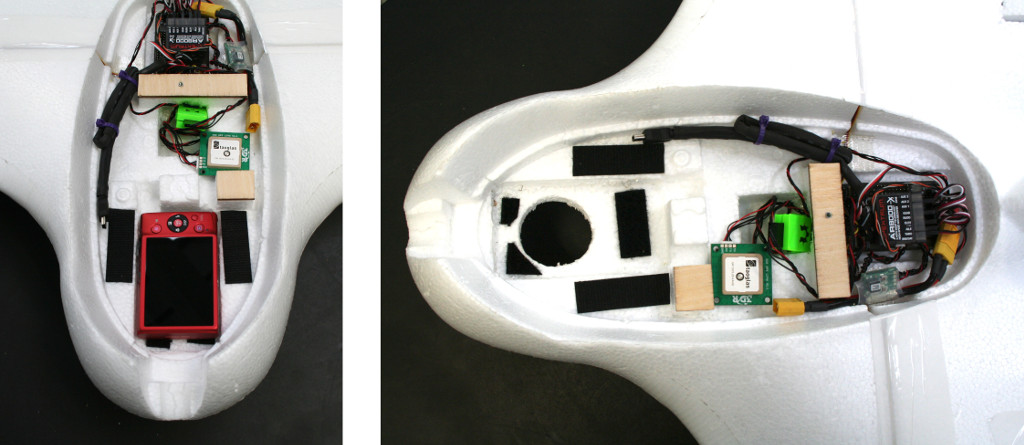 Before you’re ready for takeoff, you’ll need to pack the camera into your vehicle. For best results using plane, position the camera with the lens pointing down in the center of the plane. You may need to modify your plane’s body to create a space for the camera. Be sure to set the plane’s center of gravity with the camera in place, and keep in mind the safety of the camera in case of failure. Check out our setup for inspiration; we used velcro strips to secure the camera in place.
