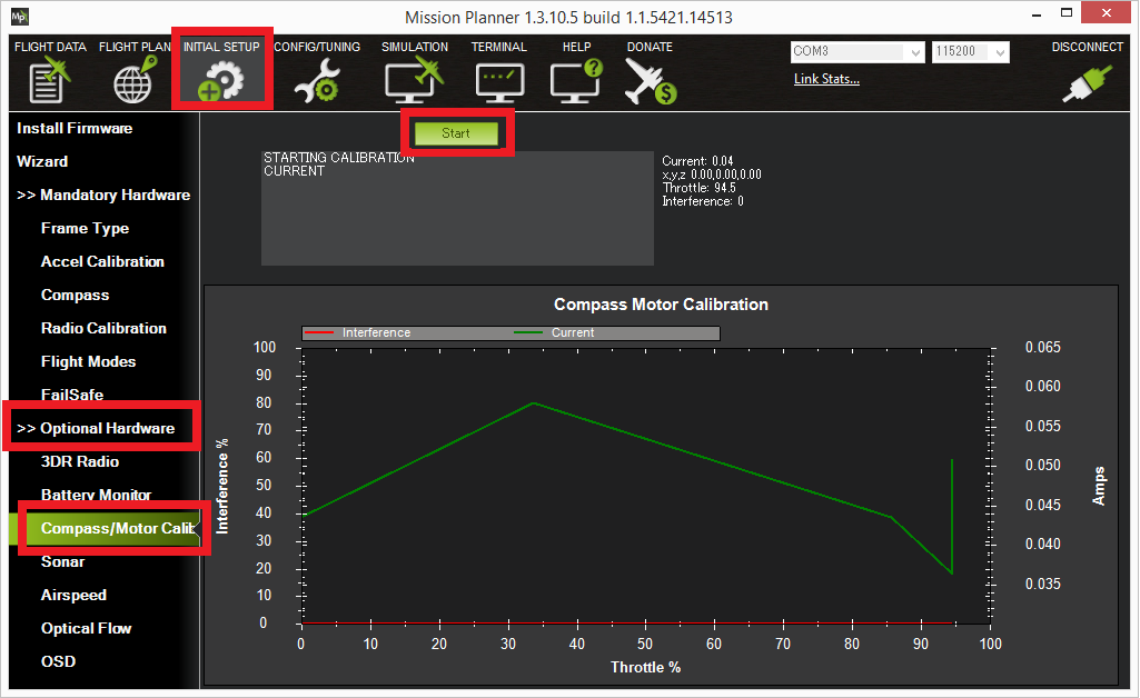This is recommended for vehicles that have only an internal compass and on vehicles where there is significant interference on the compass from the motors, power wires, etc. CompassMot only works well if you have a battery current monitor because the magnetic interference is linear with current drawn. It is technically possible to set-up CompassMot using throttle but this is not recommended.