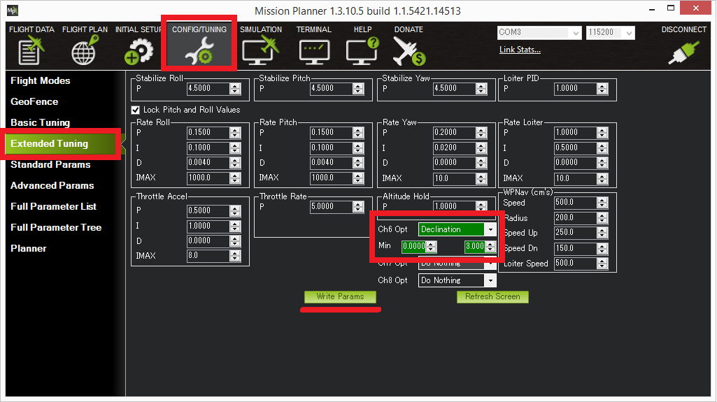 Check the declination is updating correctly when turning the channel 6 tuning knob to it’s maximum position, go to Config/Tuning | Standard Params screen, press the Refresh Params button and ensuring that