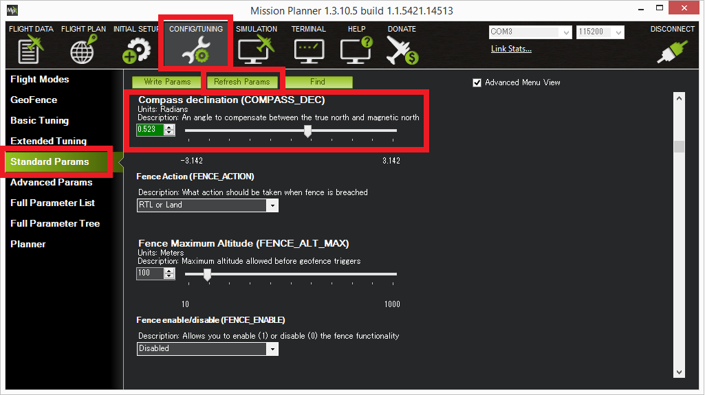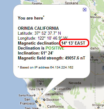 Uncheck the Obtain declination automatically checkbox and manually enter the declination (highlighted in red in the image above) into the mission planner’s declination field. In this example, we would enter “14” Degrees and “13” Minutes.