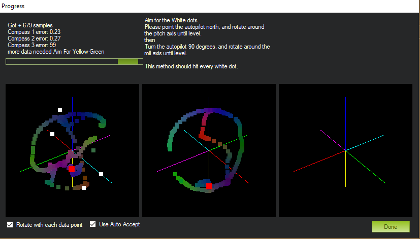 A window should pop-up showing you the state of the live calibration. This shows a sphere for each compass with a red dot showing where the compass is pointing and six “white dot” targets around the sphere. You rotate the vehicle so that the red dot reaches each white dot and causes it to disappear.