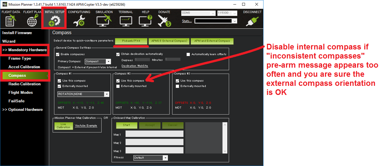 The Mission Planner Compass Setup screen can be found in menu Initial Setup | Mandatory Hardware | Compass in the sidebar. This screen is used for setting almost all compass configuration and tuning parameters.