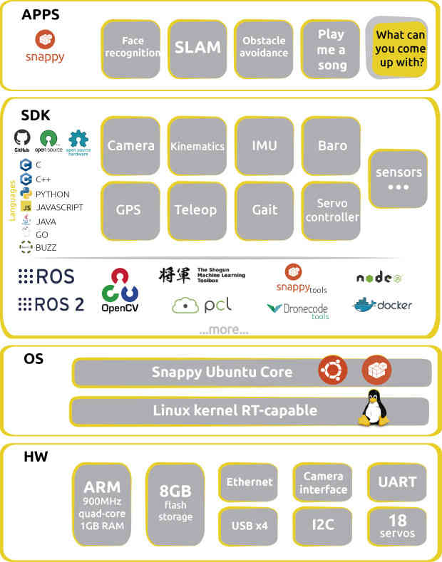 It combines an embedded Linux computer (Raspberry Pi 2) and a daughter board containing several sensors, IO and power electronics. It is a Linux embedded device that runs ArduPilot as well many other frameworks and services for robotic application development.