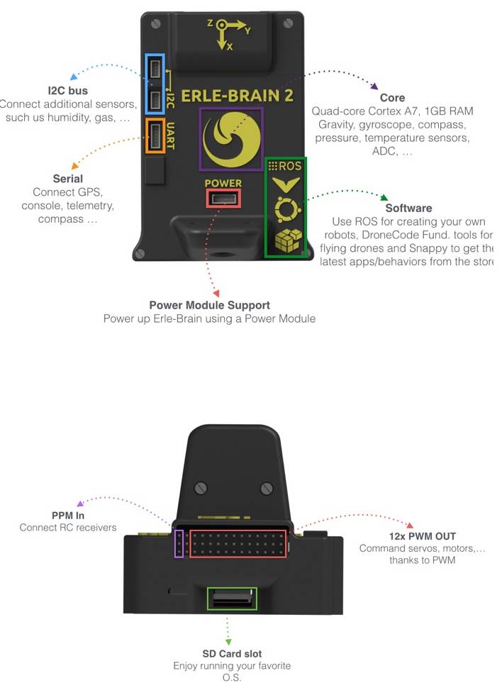 - Erle-Brain 2: The new generation of artificial robotic brains for drones and robots that use DroneCode Foundation Tools, ROS and many other tools.