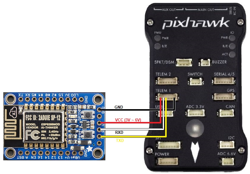 The adafruit HUZZAH ESP8266 breakout board is recommended because it can be connected to a flight controller without the need for 3.3V regulator or level shifters.