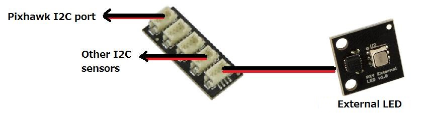 An external LED (aka “Toshiba LED”) can be added by connecting it to the flight controller’s I2C port. Because most users use a Ublox GPS and Compass module, an I2C splitter is recommended. If using a Pixhawk flight controller, once connected the LED on the center of the board may no longer light up (recent versions of ArduPilot will light up both LEDs).