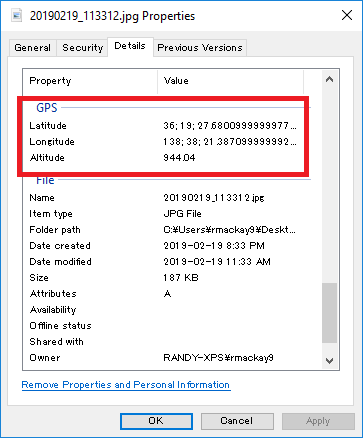 - Check the file properties to ensure the latitude, longitude and altitude have been recorded with the image