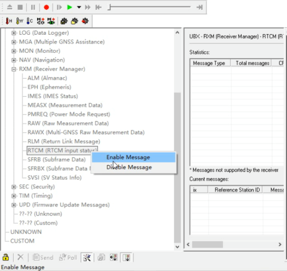 Then, click into View -> message view -> UBX -> RXM -> RTCM (RTCM input status), right click to enable message.