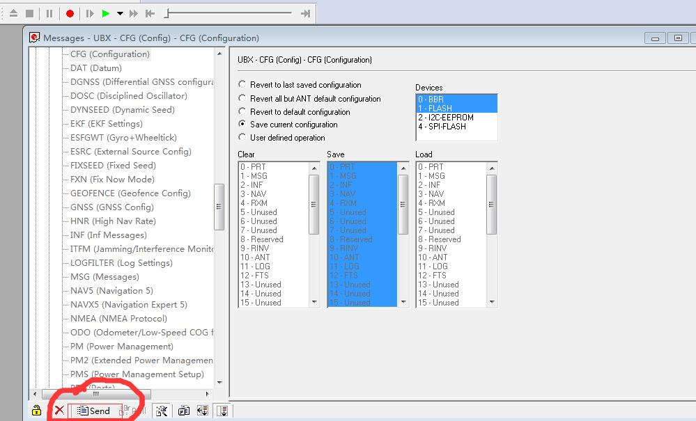 To save the current settings, go to the Messages view -> UBX -> CFG (Configuration) page and click the Save current configuration option, then click Send (as shown below).