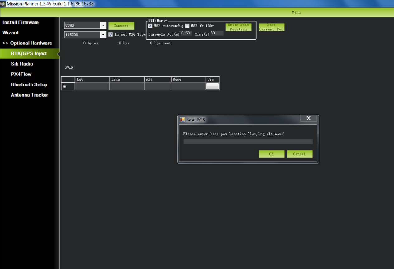 To store the current location in the Mission Planner: Click Save Current Pos, enter a name in the dialog box, and click OK. As shown below, you can see your saved location in the list. Click the Use button for the location you saved. The base station will enter the fixed mode and the status will show Using FixedLLA. In the future, if you set the base station in the same location, you do not need to conduct survey again, just click the Use button that corresponds to the location you have saved.