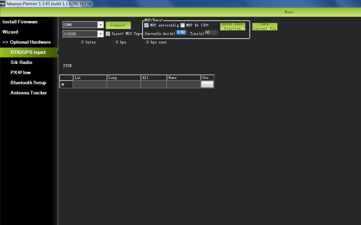 -Set Survey-in/Fixed mode for base station. Similar to Mission Planner RTK Inject page, U-center can also be used to set the base station survey-in time and accuracy. Enter the Messages view option, UBX’s CGF menu, enter the TMODE3 tab. Select 1.Survey-in under the Mode drop-down option, and set the survey time (and the minimum time required for the base station to survey). The survey-in current status can be viewed in the NAV-> SVIN page in Message View.