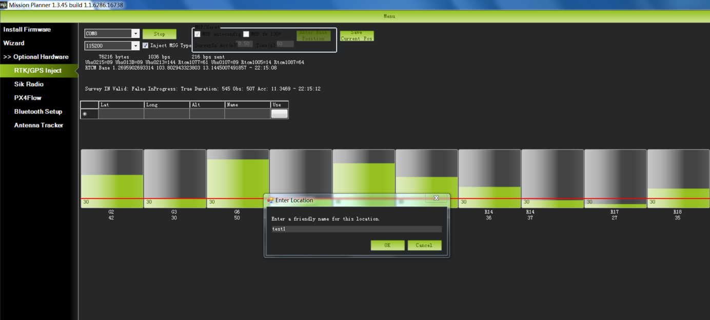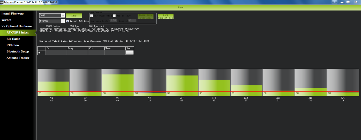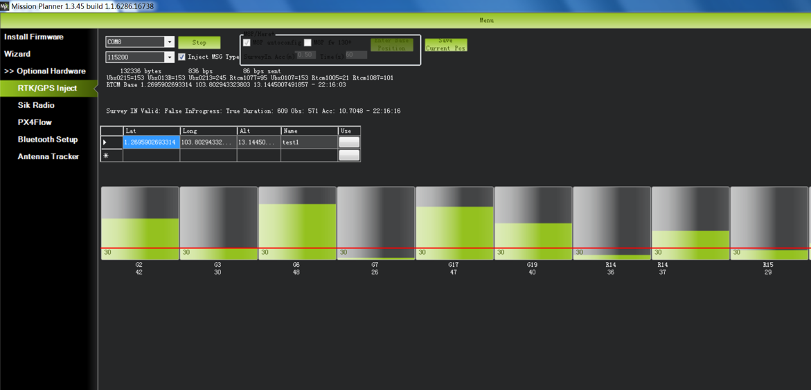 During the survey process, the right box will show the current survey status: Position is invalid: base station has not yet reached a valid location; In Progress: survey is still in progress; Duration: The number of seconds that the current surveying task has been executed; Observation: the number of observations acquired; Current Acc: Absolute geographic accuracy that the current base station can achieve. The green bar at the lower part of the Mission Planner page shows the satellites being detected and the signal strength related to each satellite.