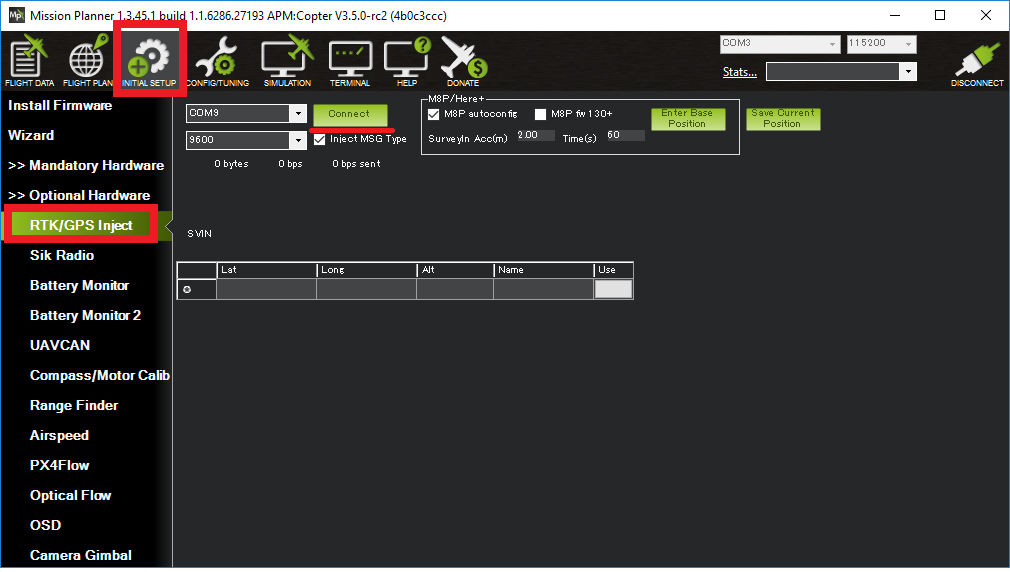- Open the Initial Setup >> Optional Hardware >> RTK GPS Inject screen