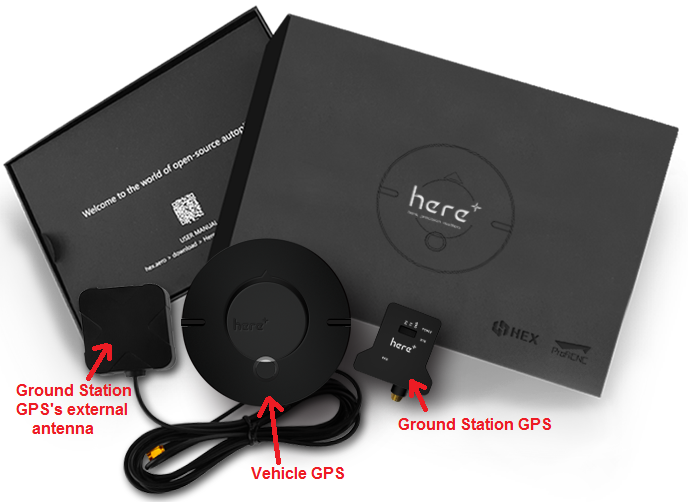 A smaller GPS (also known as the “base station”) labelled “here+” is also included along with it’s external antenna. This GPS is connected to the ground station PC using the supplied USB cable.
