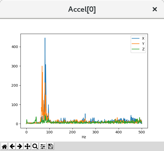 - Accelerometer data appears in the top left window with the vertical axis showing the amplitude and horizontal axis showing the frequency. The amplitude is not scaled to a useful value meaning the graph is useful for determining the frequency of the vibration but not whether the levels are too high or not. Vibration at frequencies above 300Hz may lead to attitude or position control problems.
