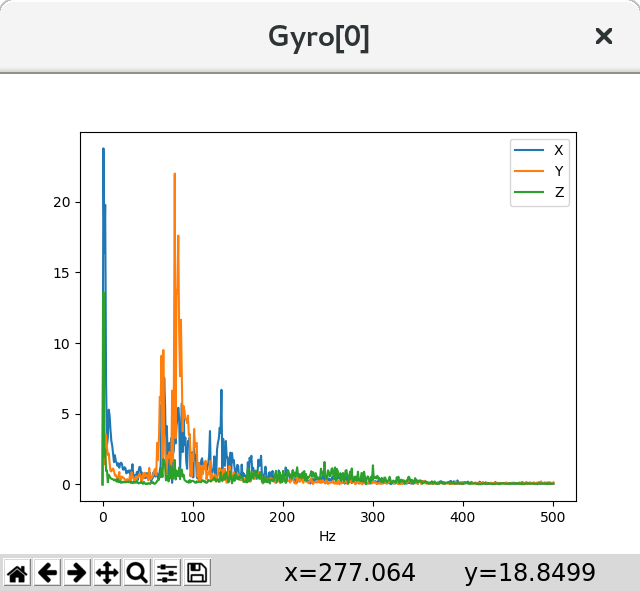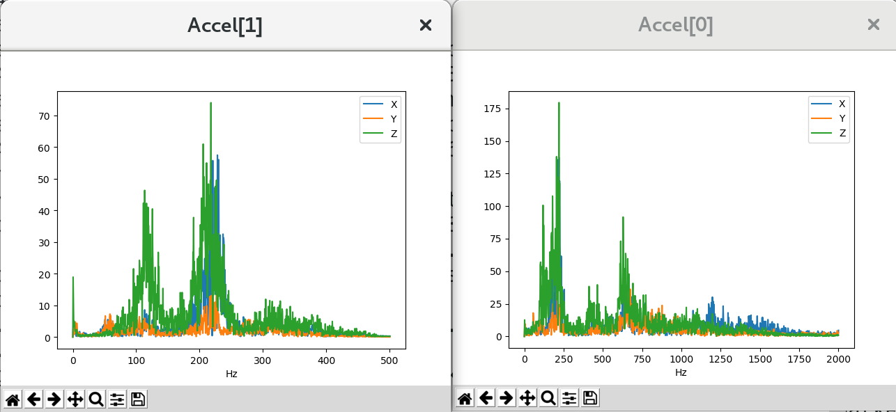 The following two graphs are from the same flight on a PixRacer flight controller. Accel[0] on the right is the InvenseSense IMU and shows higher frequencies than the slower IMU on the left